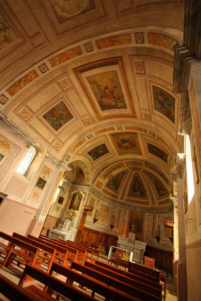 "Elle est de fondation très ancienne et figure dans la célèbre Charta Vetus, commandée par l’Evêque de Viviers, Thomas II (950). Un document nous apprend que c’est Antherius, gouverneur de province et sa femme Sulpicia, qui firent donation de l’église de St Sernin, à l’Eglise de Viviers, donc à l’époque gallo-romaine. L’intérieur en a été décoré par le peintre J-A Molinari (ou les frères Molinari), venu travailler ici après avoir restauré la chapelle du Collège des Jésuites à Aubenas. Celle-ci, détruite en 1910, s’élevait à l’emplacement de l’ancien commissariat de police. L’artiste a donc réalisé à St Sernin une copie des peintures qui ornaient les murs et les voûtes de la chapelle d’Aubenas. C’est ainsi qu’on peut voir : - dans le choeur, des peintures représentant les trois vertus théologales (foi, espérance, charité) - au fond, derrière l’autel majeur, St Saturnin - à gauche, des objets et vêtements sacerdotaux - à droite, les attributs pontificaux - sur la voûte de la nef sont peints les quatre évangélistes : St Luc, St Marc, St Mathieu et St Jean, encadrant l’Ascension du Christ et l’Assomption de Marie. - dans les chapelles latérales, à gauche un tableau (du XVIIIè siècle semble-t-il) représente St Roch ; à droite, c’est l’Assomption de Marie. "En outre, le génie du peintre a réussi à transformer l’aspect vulgaire du plâtre en marbre, les surfaces planes en relief (rosaces en trompe l’œil), le grisé en couleurs vives, donnant un sens à tout cela" Les peintures ont été nettoyées à la mie de pain et restaurées entre 1959 et 1962 par Mr Armand Fayen-Chavagnon (restaurateur du Château de Versailles), contacté par le graveur Jean Chieze, grâce à un ami habitant St Sernin. Par arrêté préfectoral du 8 Juin 1979, ces peintures murales ont été inscrites à l’inventaire supplémentaires des objets et mobiliers classés, ainsi que les statues dorées ; les quatorze stations du chemin de croix (sur toiles mortuaires en réemploi) ; la grille de communion en fer forgé (limitant l’espace d’accueil), la chaire (pied de l’autel et baptistère) ; les lambris et abat-voix du chœur.