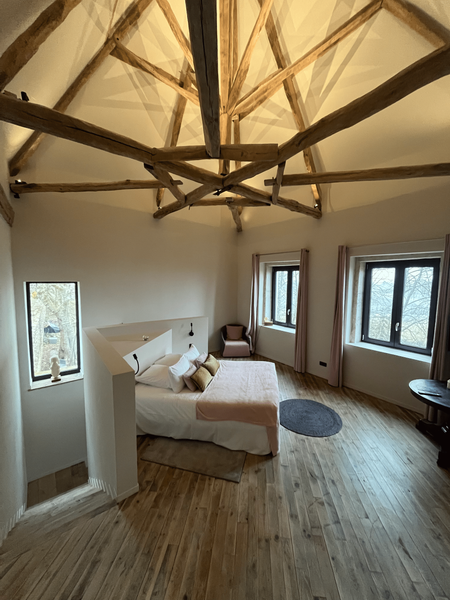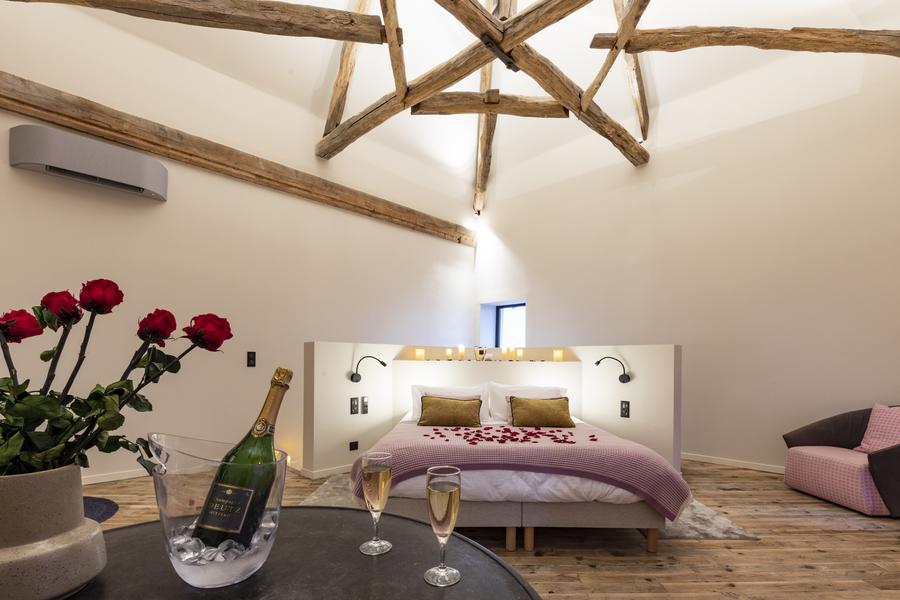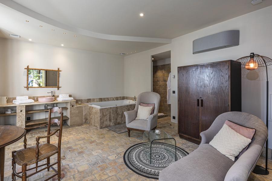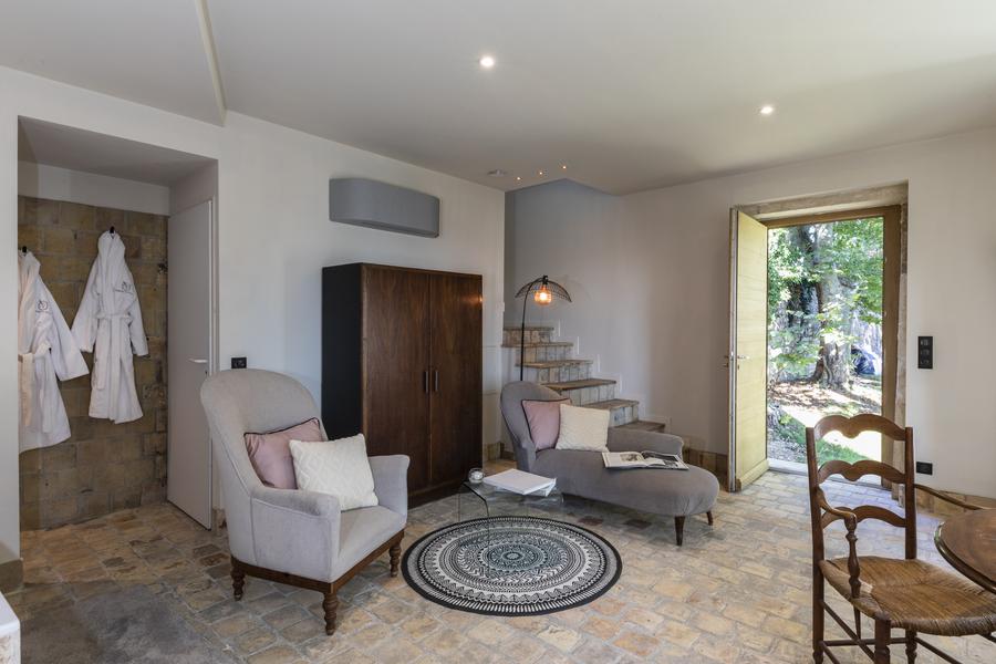 Blotti au bout du parc, avec ces murs en pierres et sa sublime charpente apparente, ce pavillon est une véritable suite de 50 m2 - un havre de paix avec une vue superbe - une immense balnéothérapie double avec chromothérapie et son extérieur privé.