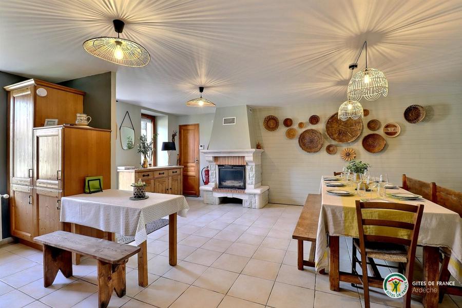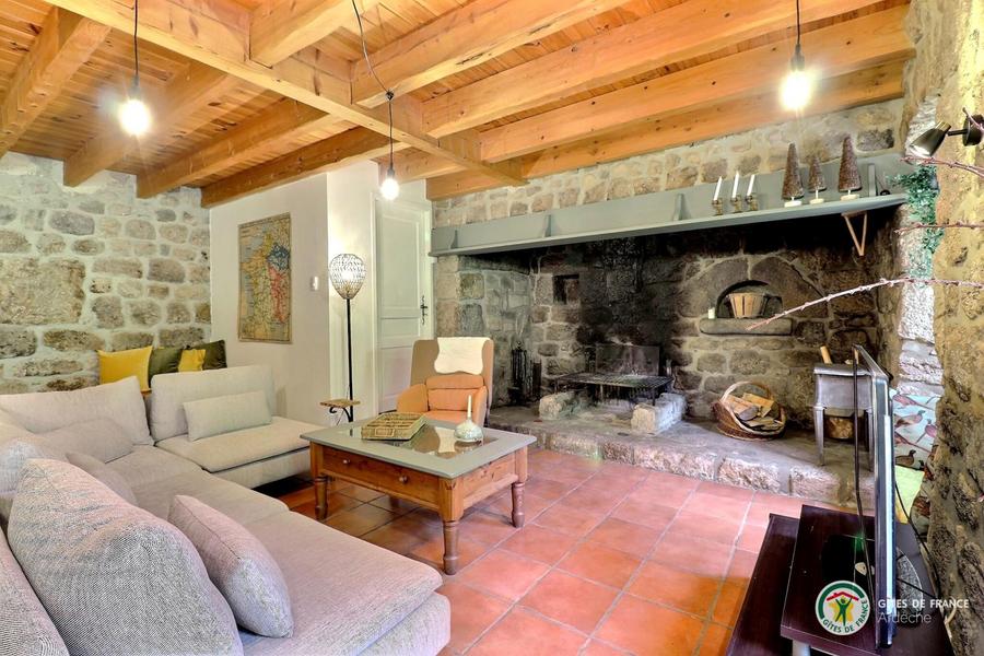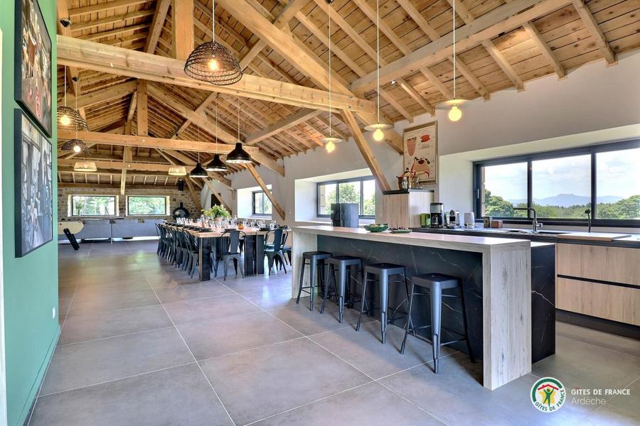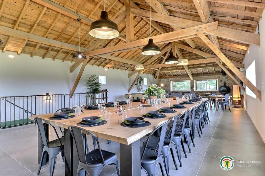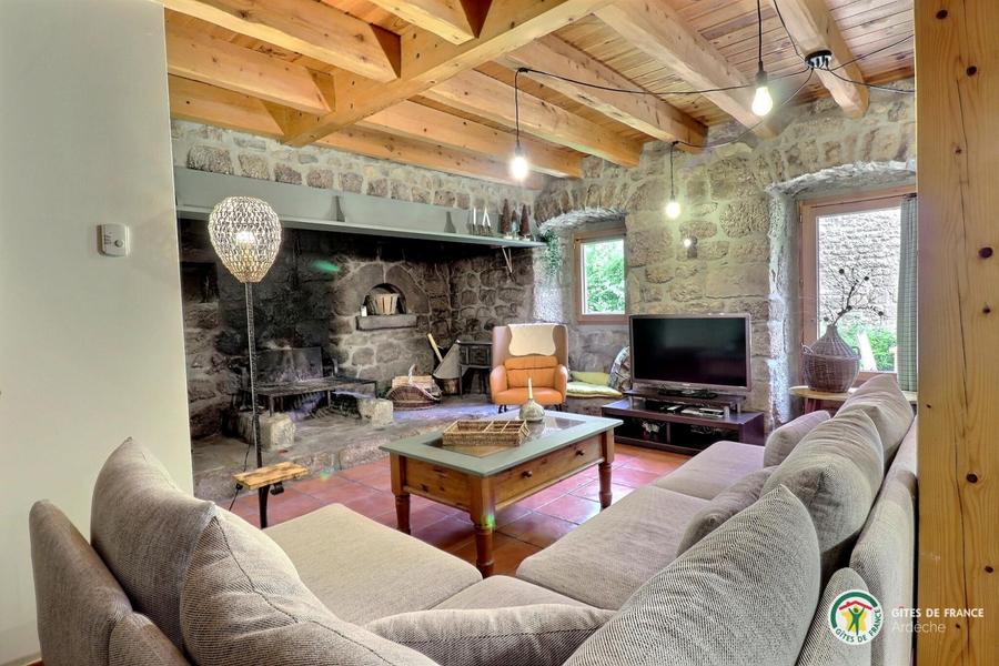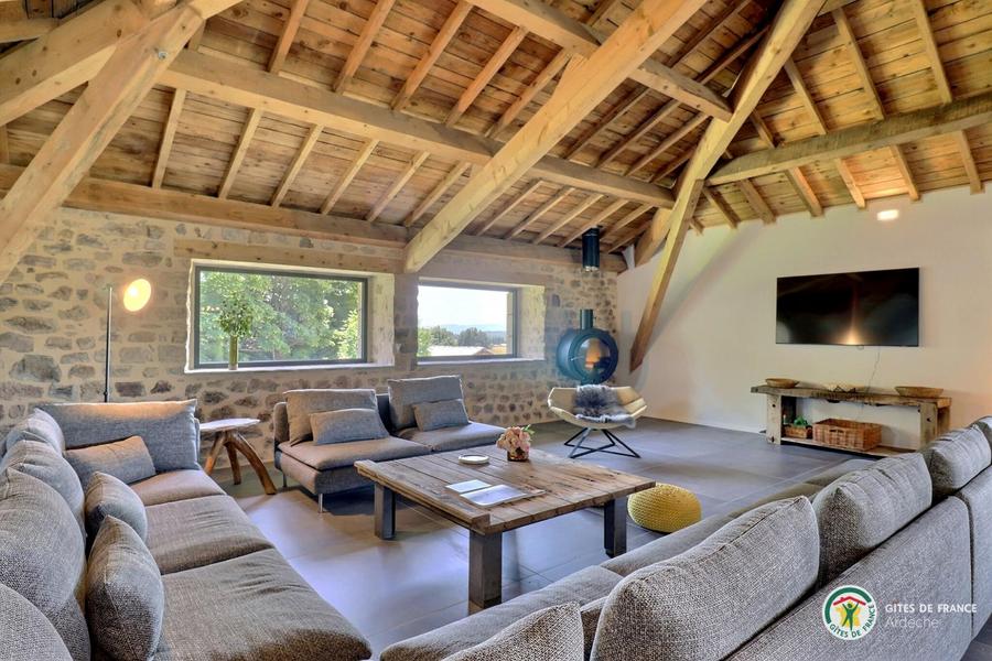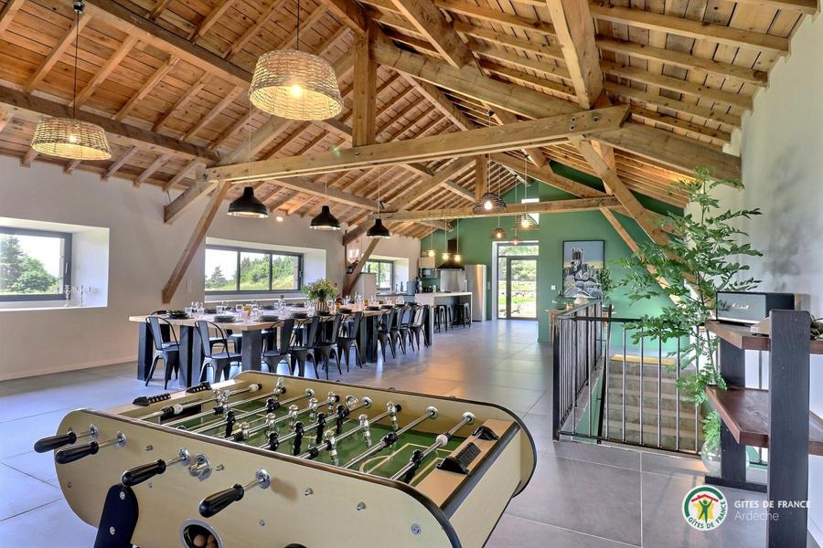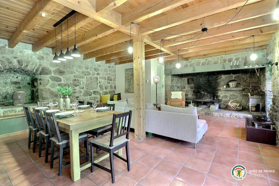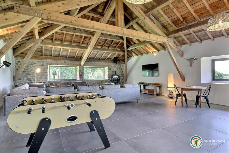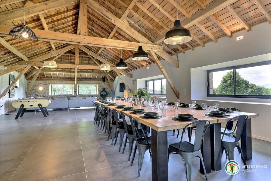 Cet ancien corps de ferme en pierre a été entièrement rénové avec goût et avec des matériaux de qualité. Vous allez être conquis par la décoration intérieure associant modernité et tradition. Situé dans un environnement naturel remarquable, le gîte vous offre un magnifique panorama sur les reliefs volcaniques du Parc Naturel Régional des Monts d’Ardèche. Le gîte est doté d’une piscine privée et chauffée de 5X12m accessible de mi-mai à fin septembre. Vous profitez également d’un grand parc et d’une terrasse où vous partagez vos repas en extérieur autour d’un brasero. Pour vos loisirs, un baby-foot, une table de ping-pong et un terrain de pétanque sont à votre disposition. L’ensemble des 3 gîtes dispose d’une entrée indépendante, il s’organise autour de la grange, une très belle pièce de plus de 150m2 où vous trouvez une grande cuisine ouverte et entièrement équipée avec un accès direct sur la terrasse et un séjour avec 2 grandes tables en bois massif. Vous pouvez également vous détendre sur l'un des canapés du grand salon et profiter de son poêle lors des soirées d'hiver. Au rez-de-chaussée de la grange, profitez d’un espace fitness/bien-être avec sauna et équipements de sport. L’ensemble des gîtes comprend 9 chambres. Chaque gîte comprend une cuisine équipée et des espaces salon/séjour avec télévision à écran plat. Pour votre confort, le linge de lit, le linge de toilette et de bain sont fournis. Vous profitez de nombreuses activités et site à découvrir à proximité : randonnée au départ du gîte, Mont Gerbier, baignade et voile au lac de Devesser, VTT et VTC sur la 'Dolce Via'. Le gîte se trouve à 50 km de Valence, 60 km de Saint-Étienne et 84 km de l’aéroport de Saint-Étienne-Loire. Un gîte idéal pour vivre de bons moments en famille ou entre amis.