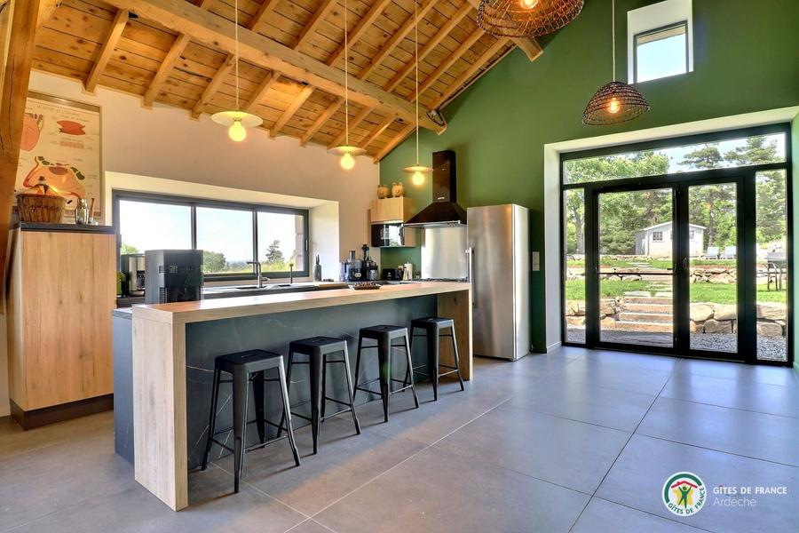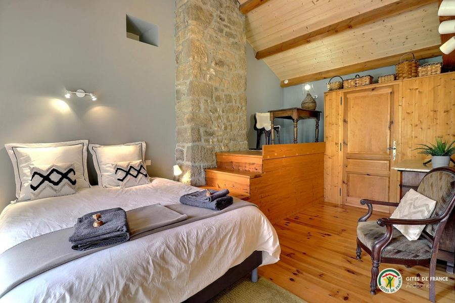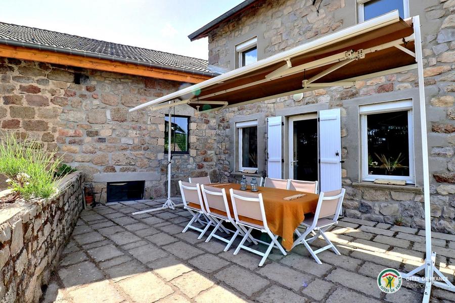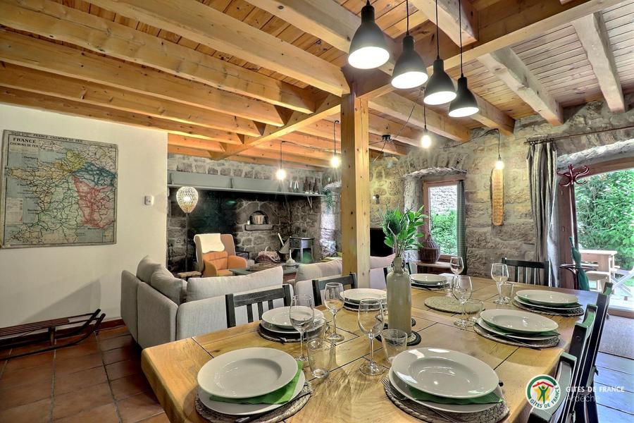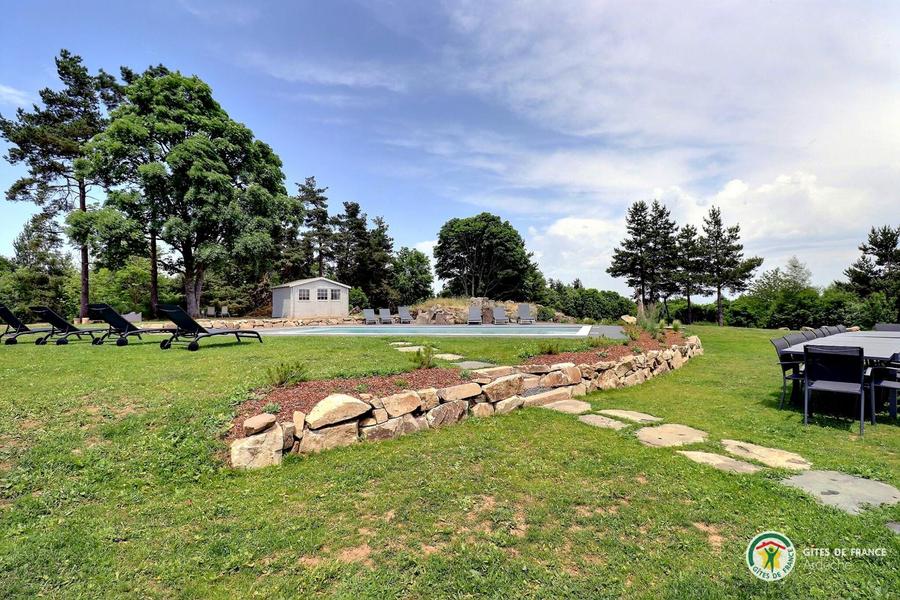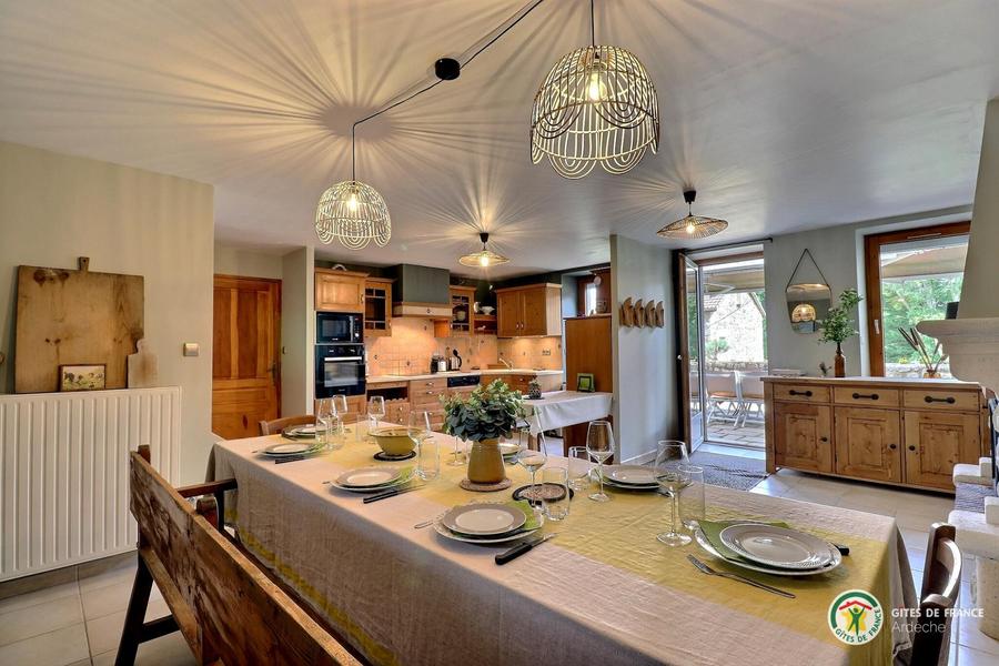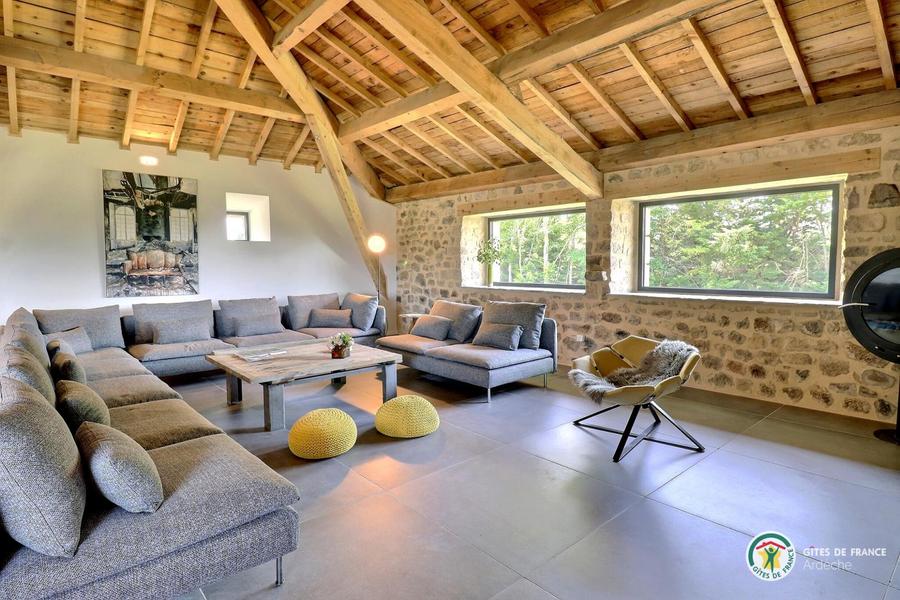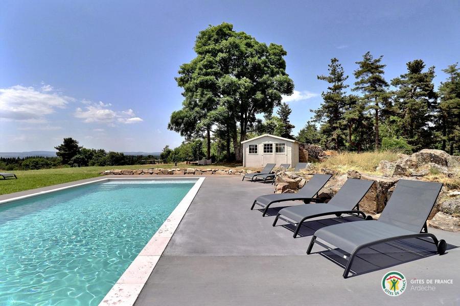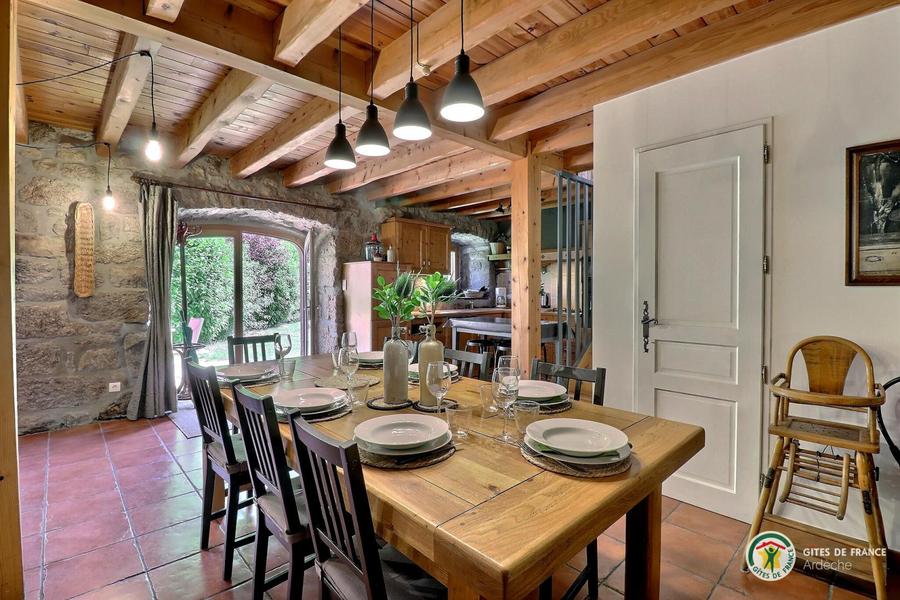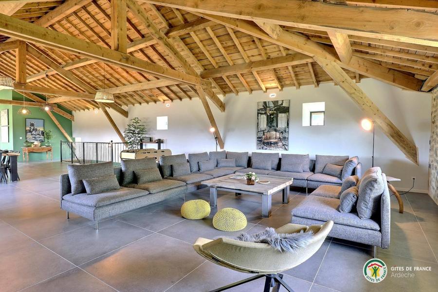Cet ancien corps de ferme en pierre a été entièrement rénové avec goût et avec des matériaux de qualité. Vous allez être conquis par la décoration intérieure associant modernité et tradition. Situé dans un environnement naturel remarquable, le gîte vous offre un magnifique panorama sur les reliefs volcaniques du Parc Naturel Régional des Monts d’Ardèche. Le gîte est doté d’une piscine privée et chauffée de 5X12m accessible de mi-mai à fin septembre. Vous profitez également d’un grand parc et d’une terrasse où vous partagez vos repas en extérieur autour d’un brasero. Pour vos loisirs, un baby-foot, une table de ping-pong et un terrain de pétanque sont à votre disposition. L’ensemble des 3 gîtes dispose d’une entrée indépendante, il s’organise autour de la grange, une très belle pièce de plus de 150m2 où vous trouvez une grande cuisine ouverte et entièrement équipée avec un accès direct sur la terrasse et un séjour avec 2 grandes tables en bois massif. Vous pouvez également vous détendre sur l'un des canapés du grand salon et profiter de son poêle lors des soirées d'hiver. Au rez-de-chaussée de la grange, profitez d’un espace fitness/bien-être avec sauna et équipements de sport. L’ensemble des gîtes comprend 9 chambres. Chaque gîte comprend une cuisine équipée et des espaces salon/séjour avec télévision à écran plat. Pour votre confort, le linge de lit, le linge de toilette et de bain sont fournis. Vous profitez de nombreuses activités et site à découvrir à proximité : randonnée au départ du gîte, Mont Gerbier, baignade et voile au lac de Devesser, VTT et VTC sur la 'Dolce Via'. Le gîte se trouve à 50 km de Valence, 60 km de Saint-Étienne et 84 km de l’aéroport de Saint-Étienne-Loire. Un gîte idéal pour vivre de bons moments en famille ou entre amis.