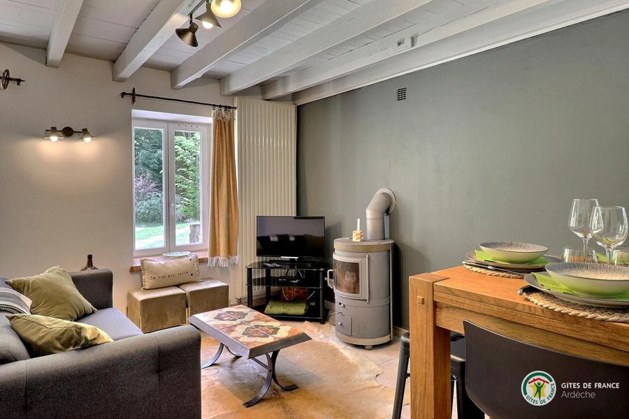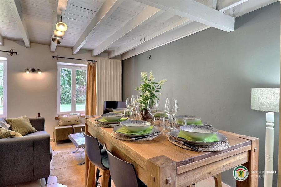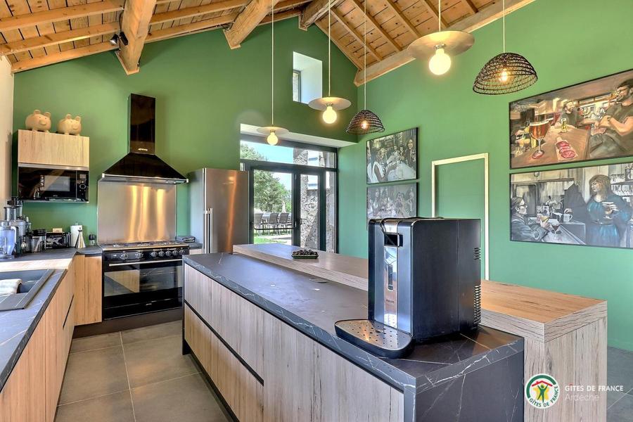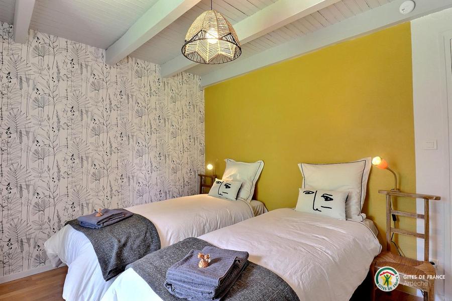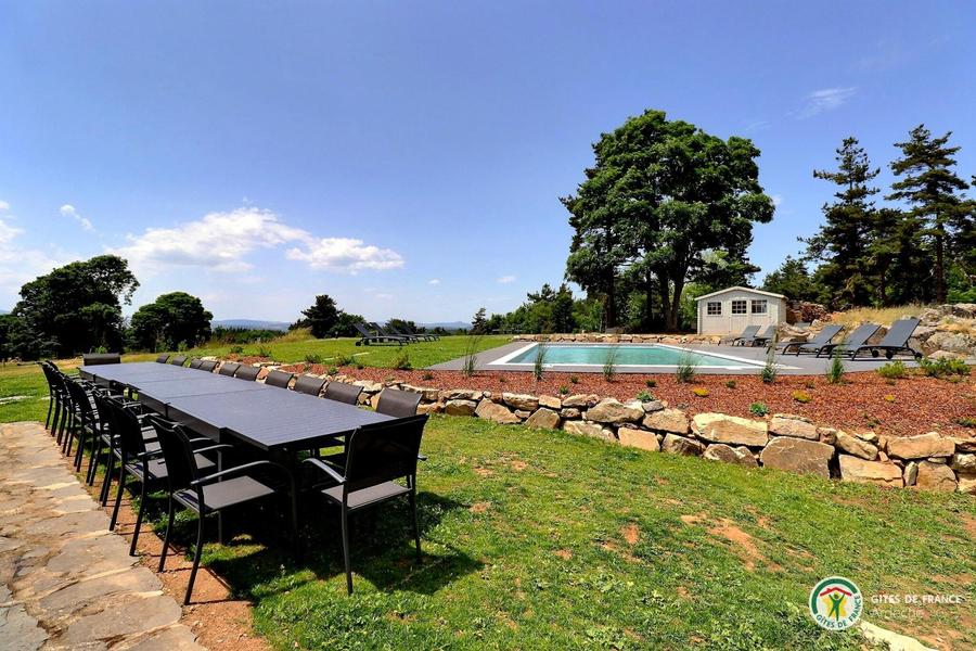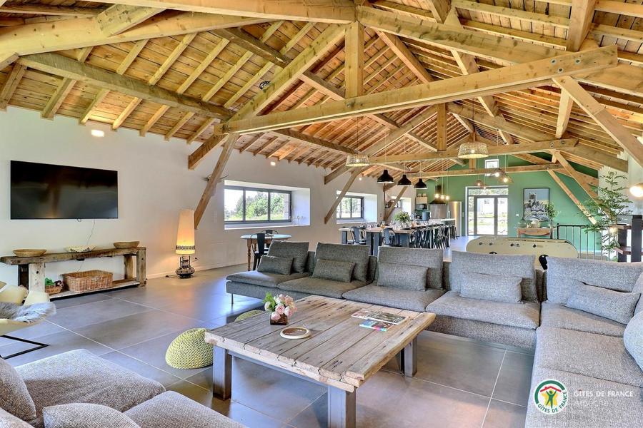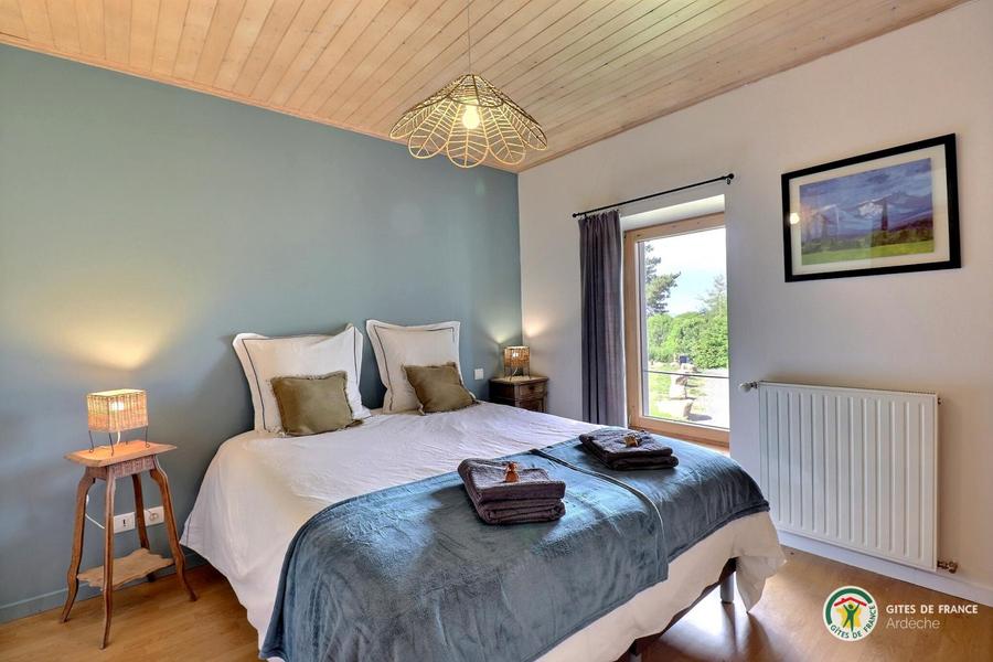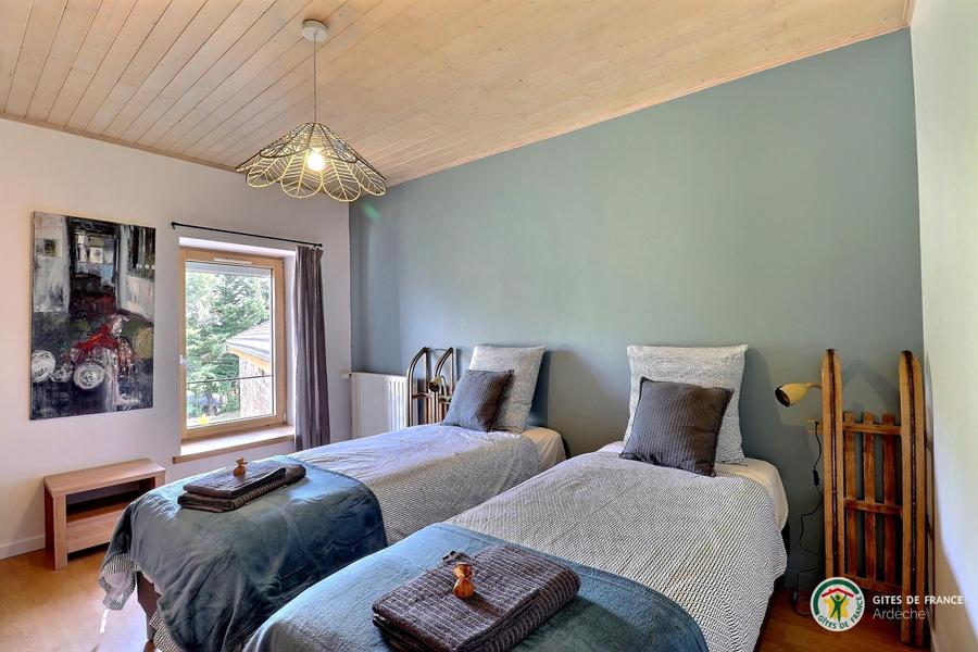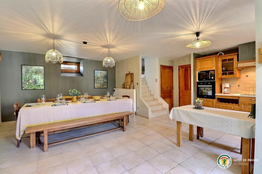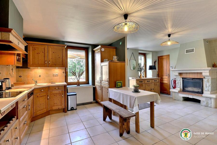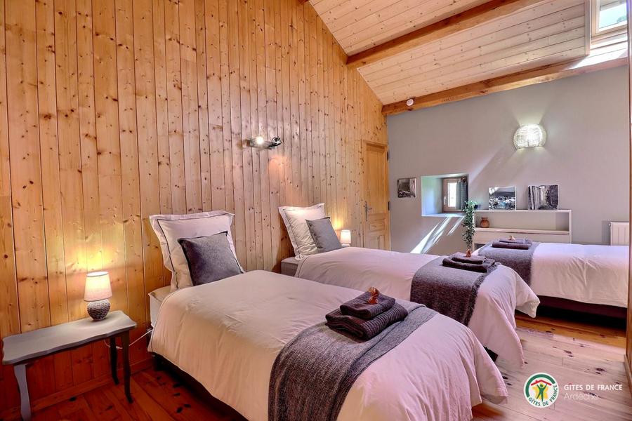 Cet ancien corps de ferme en pierre a été entièrement rénové avec goût et avec des matériaux de qualité. Vous allez être conquis par la décoration intérieure associant modernité et tradition. Situé dans un environnement naturel remarquable, le gîte vous offre un magnifique panorama sur les reliefs volcaniques du Parc Naturel Régional des Monts d’Ardèche. Le gîte est doté d’une piscine privée et chauffée de 5X12m accessible de mi-mai à fin septembre. Vous profitez également d’un grand parc et d’une terrasse où vous partagez vos repas en extérieur autour d’un brasero. Pour vos loisirs, un baby-foot, une table de ping-pong et un terrain de pétanque sont à votre disposition. L’ensemble des 3 gîtes dispose d’une entrée indépendante, il s’organise autour de la grange, une très belle pièce de plus de 150m2 où vous trouvez une grande cuisine ouverte et entièrement équipée avec un accès direct sur la terrasse et un séjour avec 2 grandes tables en bois massif. Vous pouvez également vous détendre sur l'un des canapés du grand salon et profiter de son poêle lors des soirées d'hiver. Au rez-de-chaussée de la grange, profitez d’un espace fitness/bien-être avec sauna et équipements de sport. L’ensemble des gîtes comprend 9 chambres. Chaque gîte comprend une cuisine équipée et des espaces salon/séjour avec télévision à écran plat. Pour votre confort, le linge de lit, le linge de toilette et de bain sont fournis. Vous profitez de nombreuses activités et site à découvrir à proximité : randonnée au départ du gîte, Mont Gerbier, baignade et voile au lac de Devesser, VTT et VTC sur la 'Dolce Via'. Le gîte se trouve à 50 km de Valence, 60 km de Saint-Étienne et 84 km de l’aéroport de Saint-Étienne-Loire. Un gîte idéal pour vivre de bons moments en famille ou entre amis.