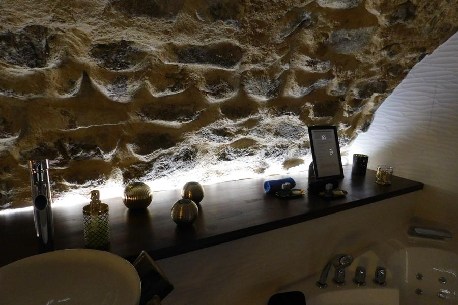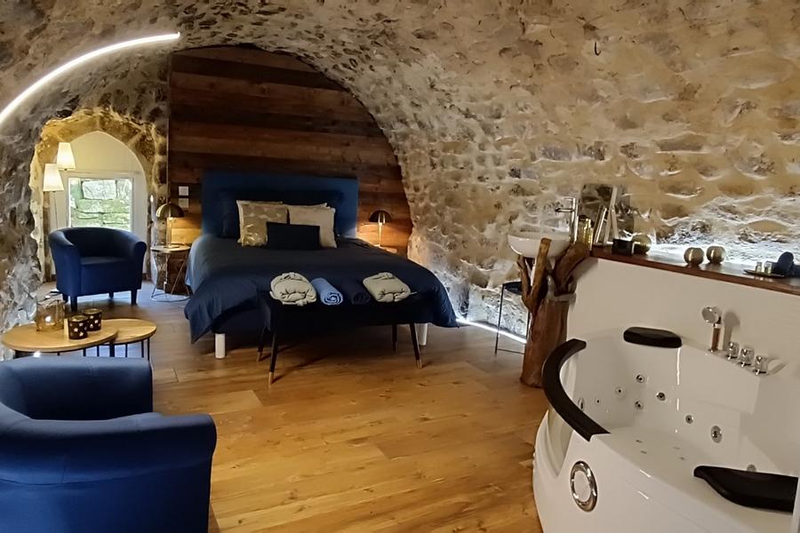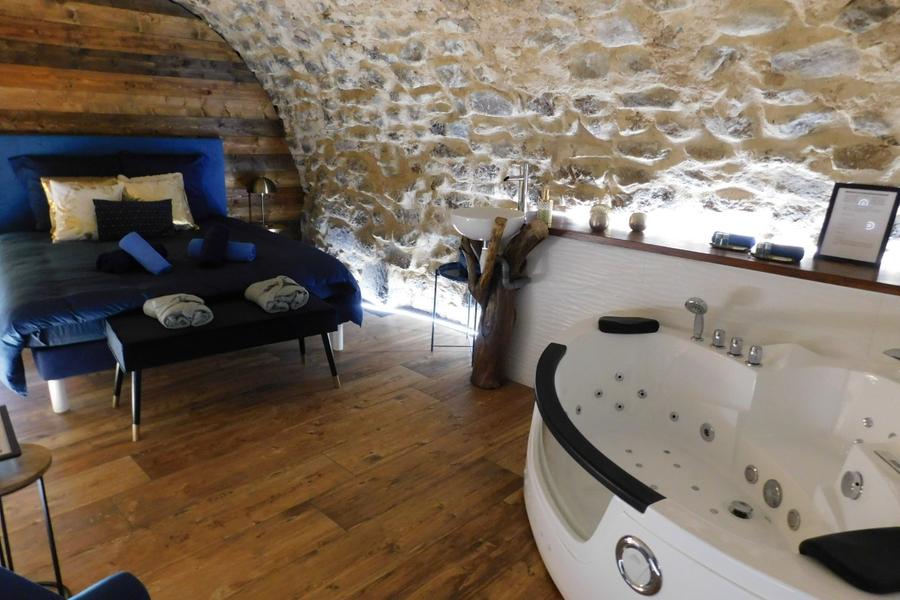 Chambre romantique avec baignoire balnéo dans les Monts d'Ardèche. Un cadre atypique et idyllique qui vous transporta dans un univers magique avec ses pierres apparentes et sa voûte. Entièrement créée et rénovée pour que vous viviez un moment reposant.