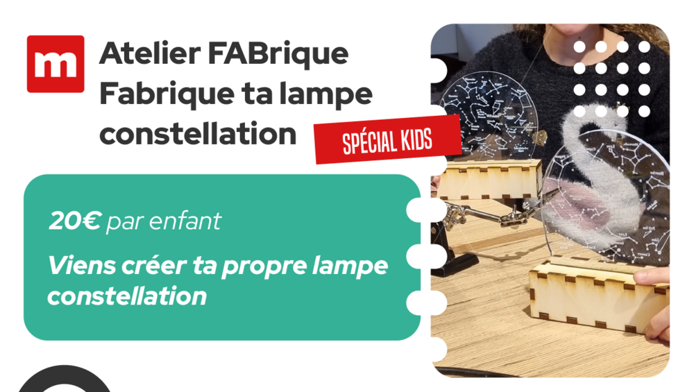 Tu es passionné.e d’astronomie ? Deviens incollable sur les constellations en fabriquant toi-même une lampe “carte du ciel” ! Elle illuminera ta chambre, te fera une jolie décoration et te montrera les différentes constellations qui peuvent être observées dans le ciel depuis la France. Les étoiles n’auront plus de secret pour toi ! Tu utiliseras les machines à commande numérique du Fab Lab de La Casemate en compagnie de Jenny qui te guidera tout au long de l’atelier !