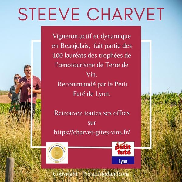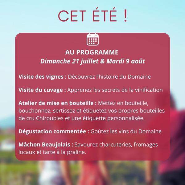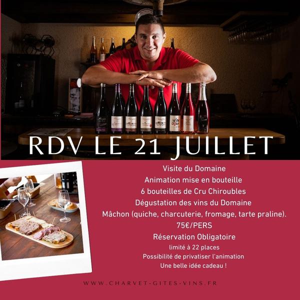 « De la Vigne à la Bouteille » vous propose une immersion complète dans l’univers viticole du Domaine Steeve Charvet. Vous débuterez votre journée par une visite guidée des vignes où vous découvrirez l’histoire du Domaine. Ensuite, Steeve Charvet le vigneron du Domaine vous conduira au cuvage et aux installations viticoles pour percer les secrets de la vinification. L'expérience se poursuit avec une animation de mise en bouteille : vous aurez l'opportunité de mettre en bouteille manuellement une cuvée du cru Chiroubles, puis de boucher, de sertir, d’étiqueter vos bouteilles et de les signez ! Après cet atelier ludique, une dégustation commentée des vins accompagnés d’un mâchon typiquement Beaujolais, composé de quiches artisanales, charcuteries et fromages locaux, et une délicieuse tarte à la praline. Chaque participant repartira avec 6 bouteilles de vin qu'il aura lui-même mises en bouteille et étiquetées, offrant un souvenir mémorable de cette expérience unique. Un cadeau idéal pour votre entourage !