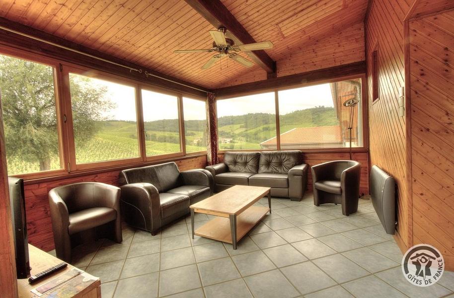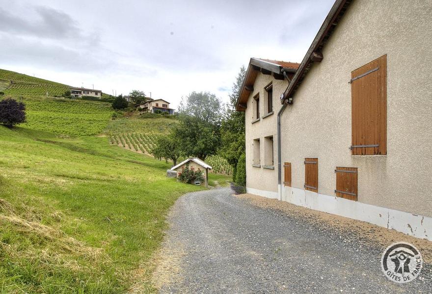 Au coeur du Beaujolais des crus, ce gîte est situé sur un domaine viticole à 1.5 km du centre de Fleurie. À l'étage : véranda (espace salon), pièce de jour (espace cuisine et espace repas), couloir accessible par quelques marches desservant 2 chambres (1 chambre avec 1 lit 2 personnes) (1 chambre avec 1 lit 1 personne), 1 salle d'eau (double vasque) et 1 Wc indépendant. À l'étage supérieur : 2 chambres (1 chambre avec 2 lits 1 personne) (1 chambre avec 1 lit 1 personne, possibilité lit d'appoint supplémentaire). Lit bébé sur demande.