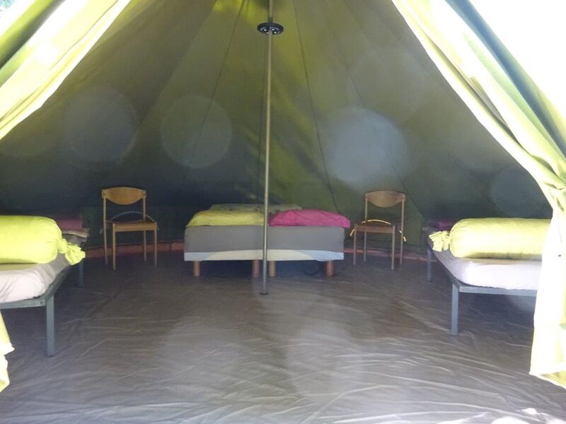 Nous proposons également 3 grandes tentes, équipées de planchers et de 8 ou 4 lits.