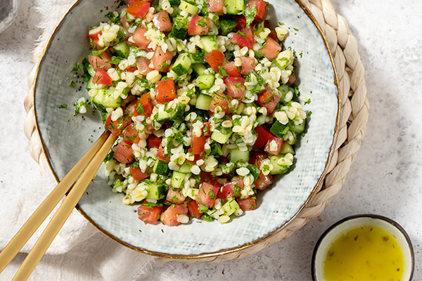 Concoctez un taboulé gourmand de petit épeautre au pesto accompagné d'une tortilla aux olives noires de Nyons AOP et de tartelettes abricot lavande.