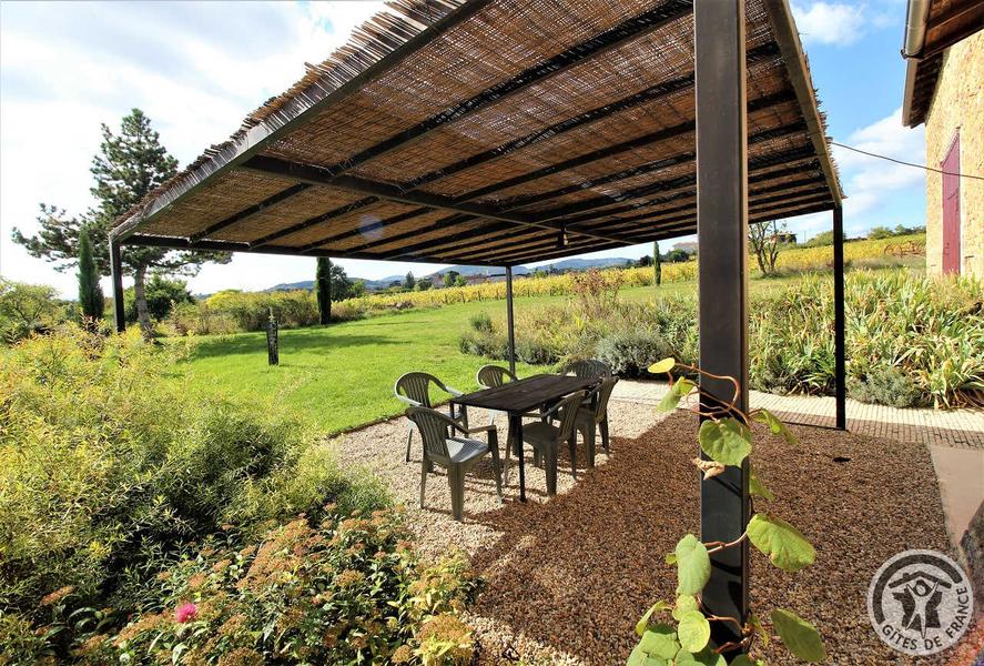 Gîte L'Annexe au Château de Pravins à Blacé (Rhône, Beaujolais, proximité de Villefranche-sur-Saône) : Terrasse avec vue sur le vignoble.