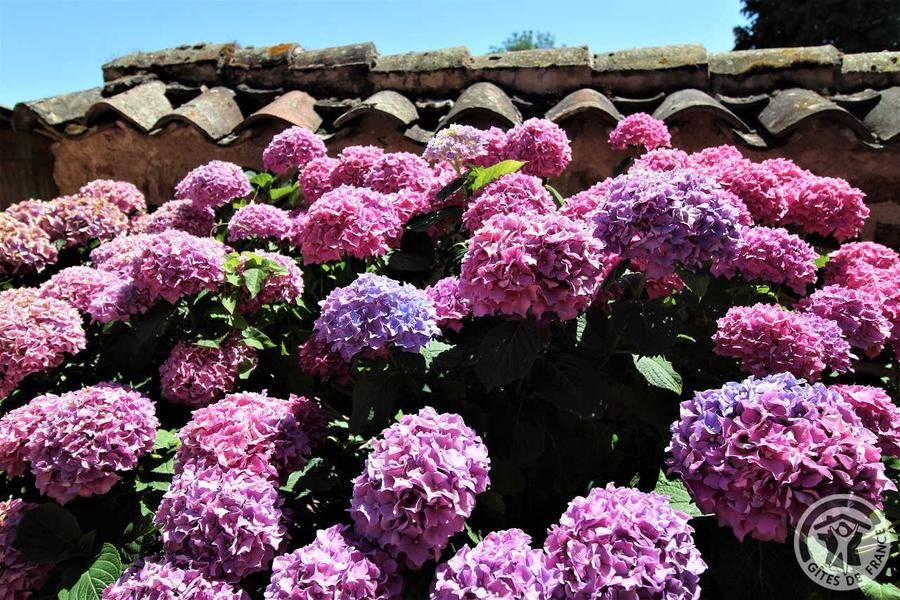 Gîte L'Annexe au Château de Pravins à Blacé (Rhône, Beaujolais, proximité de Villefranche-sur-Saône) : les nombreux hortensias à l'entrée du château.