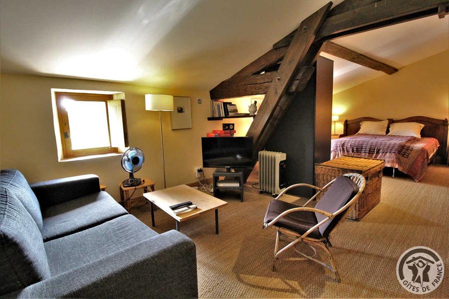Gîte L'Annexe au Château de Pravins à Blacé (Rhône, Beaujolais, proximité de Villefranche-sur-Saône) : le salon en mezzanine et chambre ouverte.
