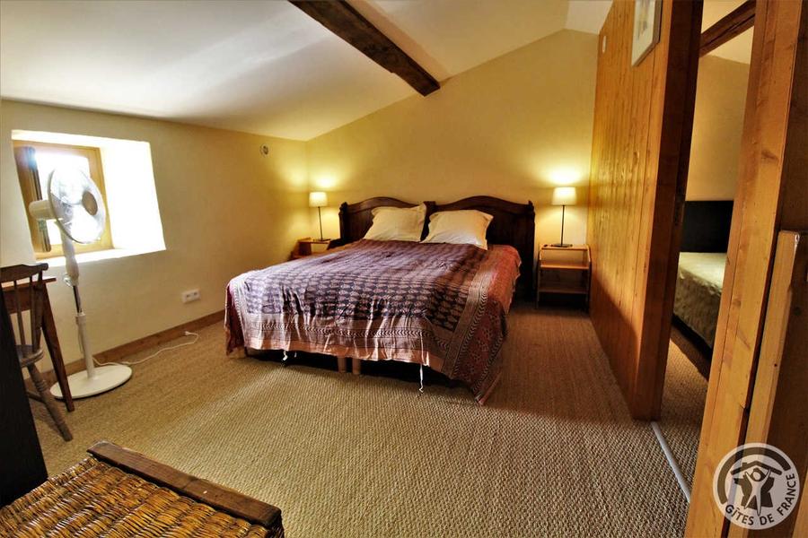 Gîte L'Annexe au Château de Pravins à Blacé (Rhône, Beaujolais, proximité de Villefranche-sur-Saône) : la chambre à l'étage (1 lit 2 personnes ou 2 lits 1 personne).