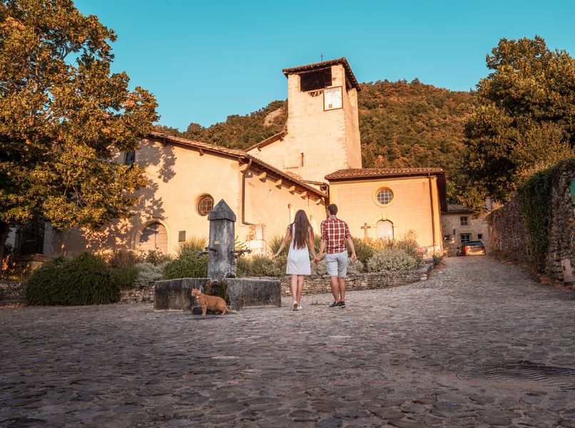 C’est un des plus beaux lieux spirituels à découvrir en Drôme : l’église, le prieuré et la chapelle des pénitents de Saint Martin d’Hostun. Cité dans les cartulaires dès le XIème siècle, cet ancien prieuré bénédictin fut la seule église d'Hostun jusqu'en 1850. Fortement remaniée au XVIème siècle, seul le choeur actuel est du XIIIème siècle. Aux XVIIIème et XIXème siècles, des chapelles latérales et un bas-côté sont ajoutés à l'édifice ainsi qu'une petite chapelle indépendante au sud, la chapelle des Pénitents, dont l'enduit a été restauré en couleurs vives originelles. On peut voir le remploi d'une inscription romaine dans le soubassement nord de la façade. Clé sur RDV à la Mairie Le site doit son existence à la fondation d'un prieuré bénédictin relevant de l'abbaye de la Chaise-Dieu. Datant de l'époque romane, l'église n'a conservé qu'un intéressant chevet plat, appareillé en petits moellons de calcaire, qui semble remonter au XIème siècle. A l'intérieur, le choeur, au sol surélevé, est voûté d'un berceau brisé. Du Moyen Age subsiste également une petite chapelle du XIIIème siècle, à la voûte d'ogives un peu fruste. Sa clé porte le blason des anciens seigneurs des lieux. La nef et la façade occidentale ont été entièrement reprises entre le XVème et le XVIèmes siècles. Au siècle suivant, un modeste sanctuaire, la chapelle Saint-Antoine, fut adjoint à l'église. Une confrérie de Pénitents Blancs s'y établit dès 1774. Cette chapelle, dont on a restitué les enduits extérieurs, possède encore ses stalles et ses boiseries d'origine. Au XVIIIème siècle, l'église fut de nouveau agrandie par l'aménagement de deux chapelles au nord de la nef et d'un bas-côté au sud. Enfin, un exceptionnel ensemble de décors en trompe-l'oeil, exécuté sur tous les murs intérieurs dans un style italianisant, paracheva au XIXème siècle la longue histoire de l'édifice. Jouxtant l'église, l'ancien cimetière, figé depuis le déplacement de l'édifice de culte paroissial, aligne un ensemble remarquable de stèles, toutes antérieures au XIXème siècle. Des travaux réalisés sur la place ont mis au jour une nécropole antique et médiévale en continuité avec ce cimetière. A cette occasion, on dégagea ausi un fragment de sarcophage gallo-romain, remployé dans le mur de façade, visible à gauche du portail.